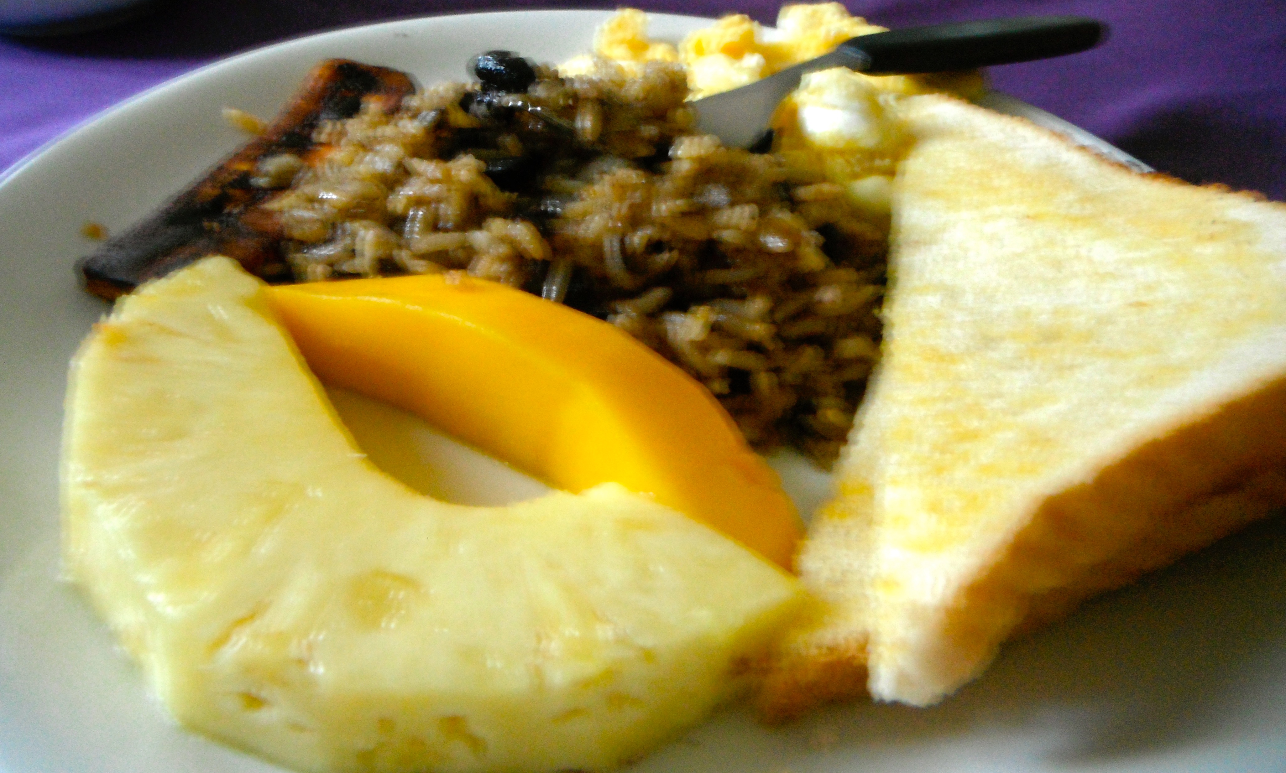 The overflowing plate included eggs, toast (OK, that’s pretty normal), sour cream, mango and pineapple slices and rice and beans. Don’t get me wrong, I like rice and beans as much as – if not more – than anyone, but for breakfast?