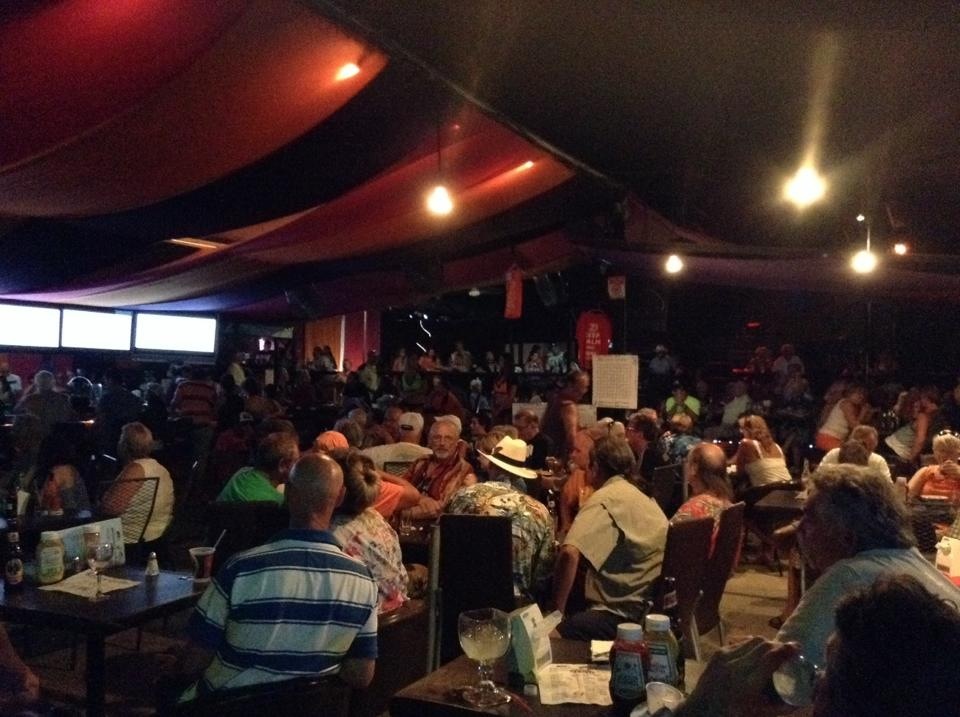 Across the street at Zi Lounge, the place is rocking. Patrons are lifting their beers and umbrella-festooned tropical drinks in happy cheers, slapping high fives with their neighbors and screaming indecipherable epithets to one another and into the street. Five huge screen TVs are blasting the NFL championship game.