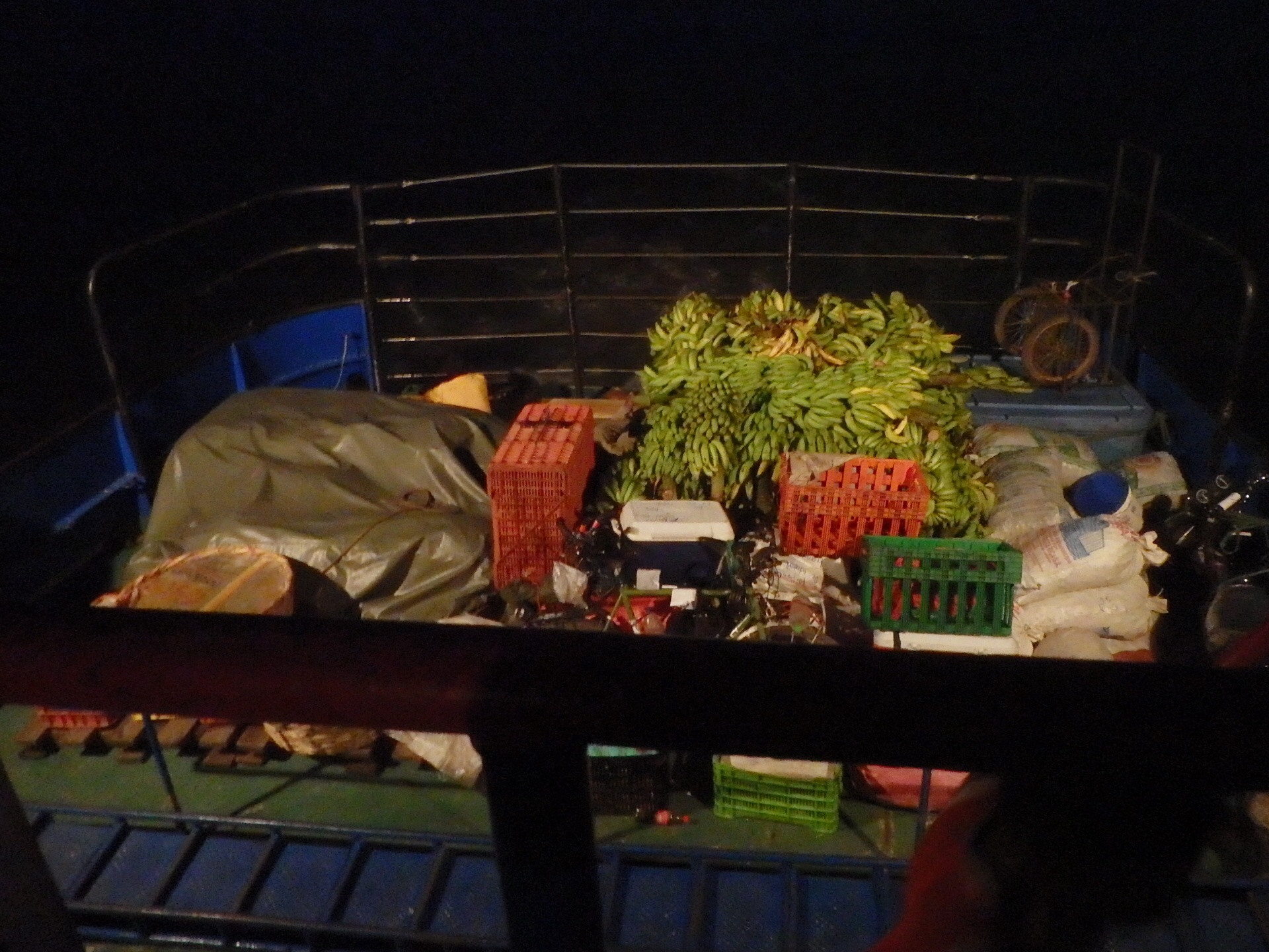On the other side of the gate, lorded over by a security guard with a menacing shot gun and a soft heart, plantains are being loaded into ancient wooden sailboats before the sun goes down. Trucks and ox-drawn carts bring the fruit to the waterfront where they are stuffed into the boats by young men who wear their shirts tired around their heads. Once the boats are full and lying low in the water, the plantains are covered with leaves and the deck is put over them.