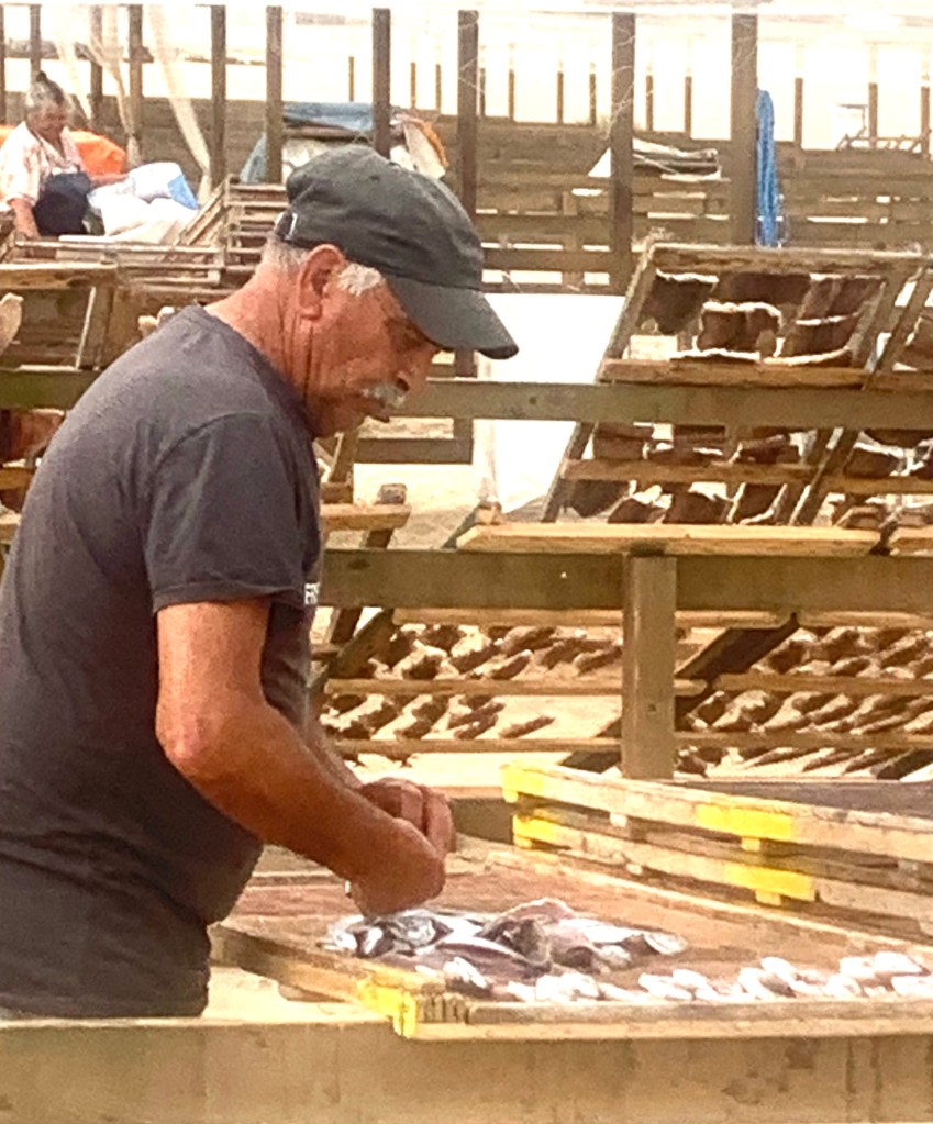 When the boats arrived each morning, fish were quickly bought up by the townspeople. What wasn’t sold was quickly skinned, filleted, brined, and hung on wood-framed mesh in the sun. On a sunny, breezy day, the fish would be dried by sunset. While the fishermen were out the next morning, their wives would sell the dried fish.